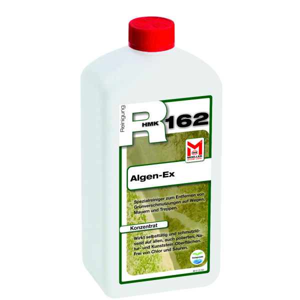 Der Algenentferner HMK R162 Algen-Ex ist ein chlor- und säurefreier Spezialreiniger (Konzentrat). Er löst und beseitigt mühelos hartnäckige Algen und Grünbelag von Wegen, Mauern, Treppen, Terrassen und Fassaden aus Natur- und Kunststein. Aktive Reinigungs-Komponenten sorgen für einen vorbeugenden Effekt, eine Neubildung dieser Verschmutzungen wird für längere Zeit vermindert. Polierte Oberflächen werden nicht angegriffen.