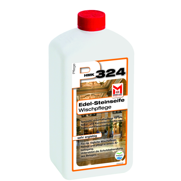 HMK P324 Edel-Steinseife - Wischpflege ist ein milder Naturseifenreiniger für die tägliche/laufende Anwendung. Hochaktive Wirkstoffe reinigen und pflegen schnell und gründlich alle Naturstein- und Kunststein-Oberflächen, Cotto-, Ziegel- und Klinkerbeläge, sowie unglasierte Fliesen. Natürliche Pflegekomponenten optimieren die Farbe und Struktur des Belages. Die Wischpflege HMK P324 ist speziell auf Natur- und Kunststein abgestimmt und verleiht Wand- und Bodenflächen ein brillantes Aussehen. Bei regelmäßiger Anwendung werden die Beläge unempfindlicher gegen Flecken und gestalten sich pflegeleichter. Die wasserlöslichen Inhaltsstoffe vermindern Schlierenbildung und bauen keine Schichten auf (z.B. Kalk-/Seifenrückstände).